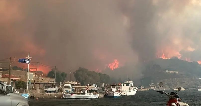 Πολίτες απεγκλωβίζονται από παραλίες του νησιού, ενώ βίντεο δείχνουν τις φλόγες να το ζώνουν , για δεύτερη φορά μέσα σε αυτό το καλοκαίρι.